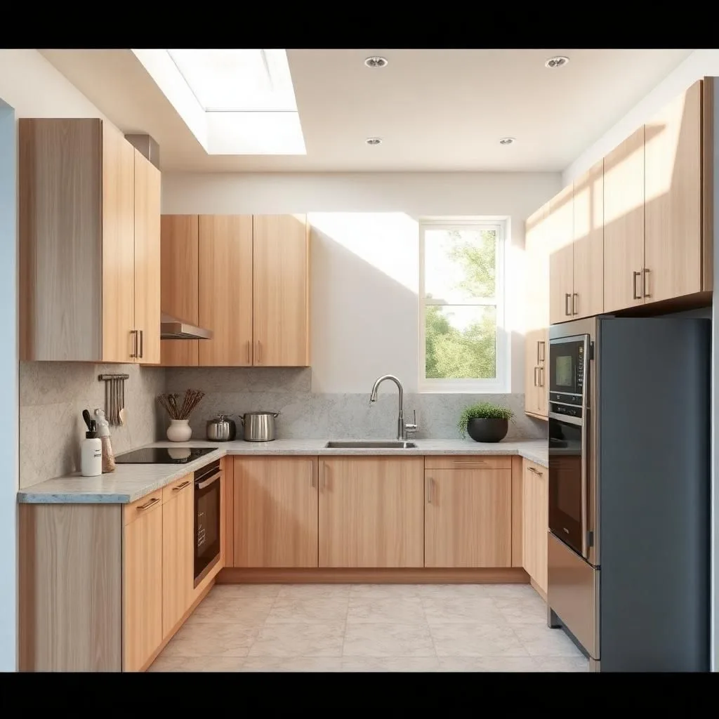 Tủ bếp chữ L: Tận dụng góc, tăng diện tích lưu trữ.