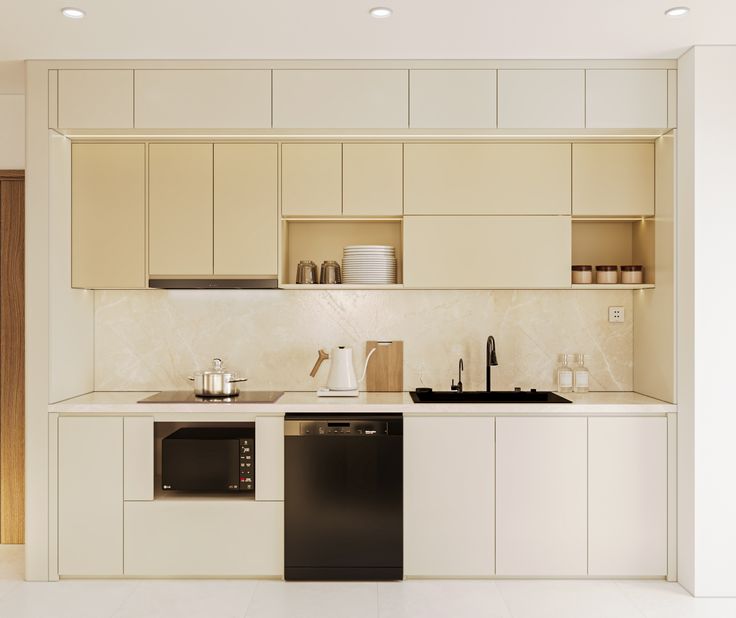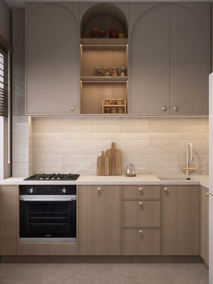 Ánh sáng cũng là yếu tố quan trọng trong bố trí tủ bếp. Việc kết hợp ánh sáng tự nhiên và hệ thống đèn LED chiếu sáng giúp không gian trở nên thông thoáng, đồng thời hỗ trợ tốt hơn trong quá trình nấu ăn. Đặc biệt, với các căn hộ chung cư có diện tích hạn chế, việc tận dụng ánh sáng hợp lý sẽ góp phần tạo cảm giác rộng rãi hơn cho toàn bộ khu vực bếp.