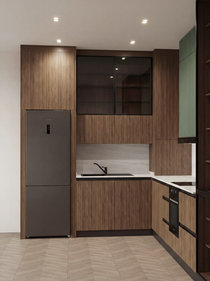 Một trong những đặc điểm nổi bật của tủ bếp chung cư hiện đại là sự linh hoạt trong thiết kế. Các dạng tủ bếp chữ I, chữ L hoặc chữ U được sử dụng phổ biến tùy thuộc vào mặt bằng căn hộ. Tủ bếp chữ I phù hợp với không gian nhỏ hẹp, trong khi tủ chữ L giúp tận dụng góc chết hiệu quả. Với những căn hộ có diện tích rộng hơn, tủ bếp chữ U sẽ mang lại sự tiện nghi tối đa trong quá trình sử dụng.