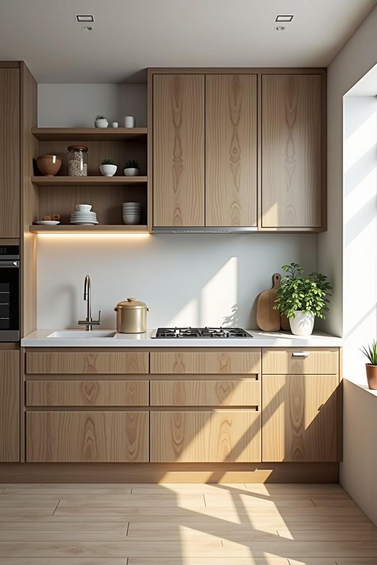 Thiết kế không tay nắm (handleless) cũng đang trở thành lựa chọn phổ biến. Điều này giúp tủ bếp trông liền mạch, sang trọng và dễ vệ sinh hơn. Bên cạnh đó, hệ thống đèn LED tích hợp trong tủ cũng được ứng dụng nhiều, tạo điểm nhấn ánh sáng và tăng tính tiện ích khi sử dụng ban đêm.