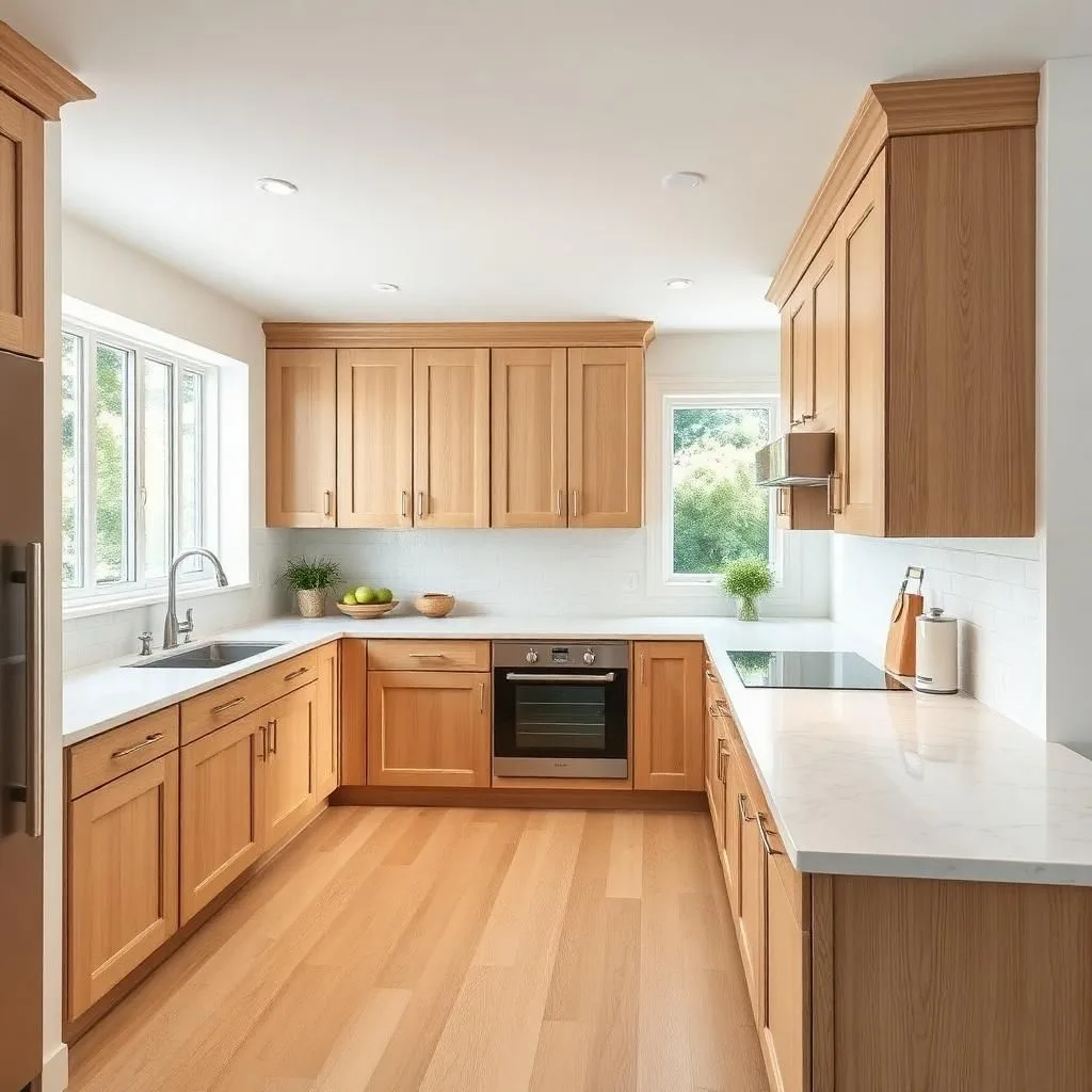Gam trắng, gỗ sáng, ánh sáng tự nhiên.