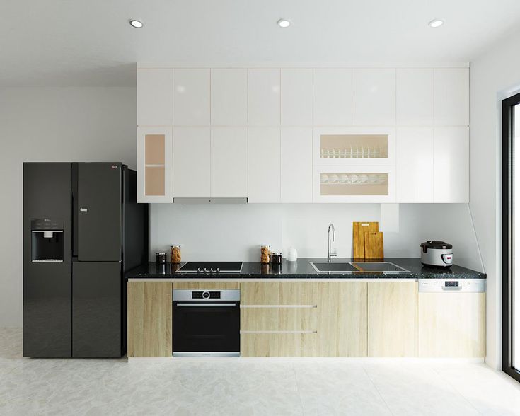 Trên thực tế, tủ bếp chữ I có thể được biến tấu theo nhiều phong cách khác nhau để phù hợp với nhu cầu và gu thẩm mỹ của từng gia đình. Một trong những mẫu phổ biến là tủ bếp chữ I kết hợp tủ trên kịch trần, giúp tăng không gian lưu trữ và hạn chế bụi bẩn bám trên bề mặt tủ.