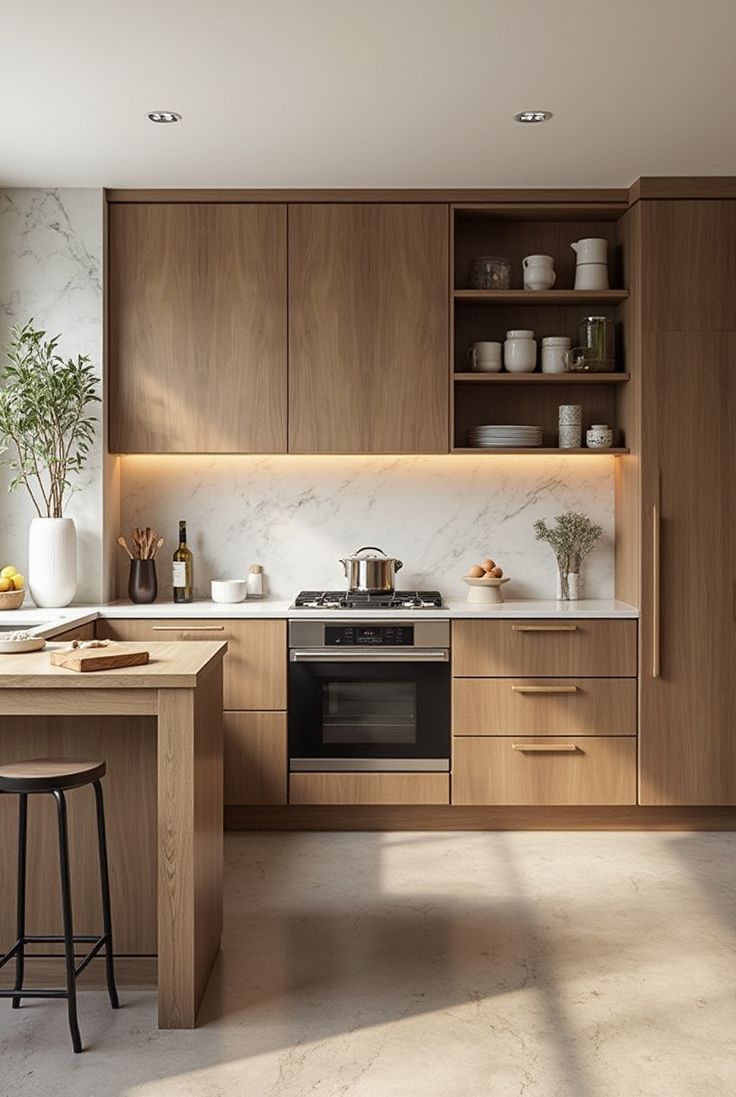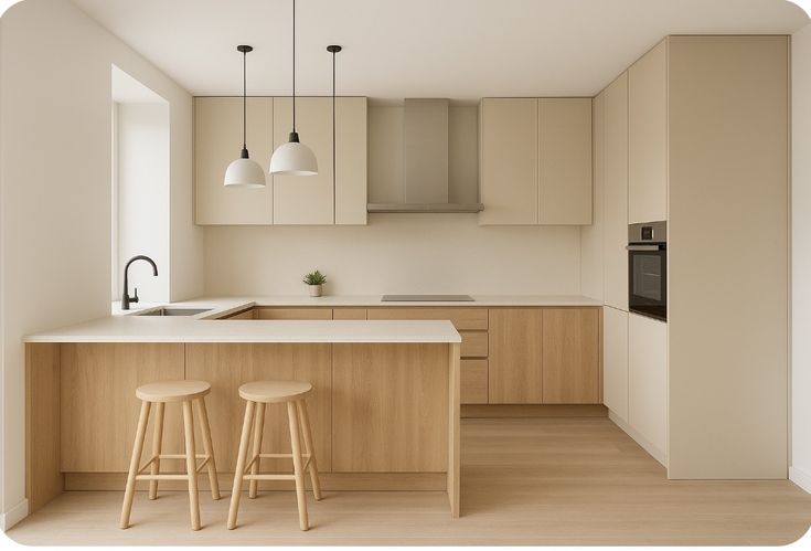 Phong cách tối giản tập trung vào việc loại bỏ các chi tiết rườm rà, hướng đến sự tinh tế và tiện dụng. Tủ bếp chữ G theo phong cách này thường có thiết kế gọn nhẹ, ít tay nắm, ưu tiên hệ tủ âm và phụ kiện thông minh. Màu sắc chủ đạo thường là những gam màu nhẹ nhàng, tạo cảm giác rộng rãi và thoáng đãng.