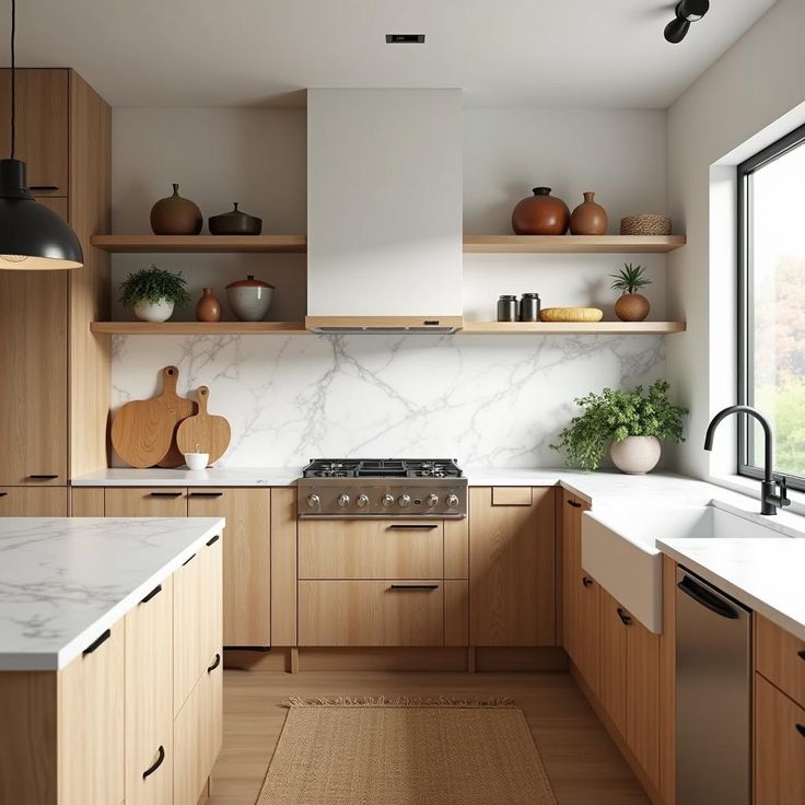 Phong cách hiện đại tối giản vẫn là xu hướng chủ đạo. Những mẫu tủ bếp sử dụng gam màu trung tính như trắng, xám, be kết hợp với kệ gỗ tự nhiên mang lại cảm giác nhẹ nhàng, tinh tế. Kệ trang trí thường được bố trí xen kẽ giữa các tủ trên để tạo điểm nhấn.