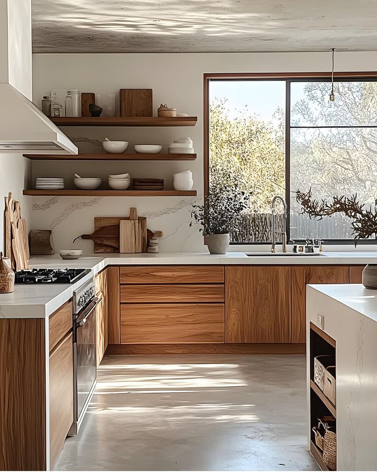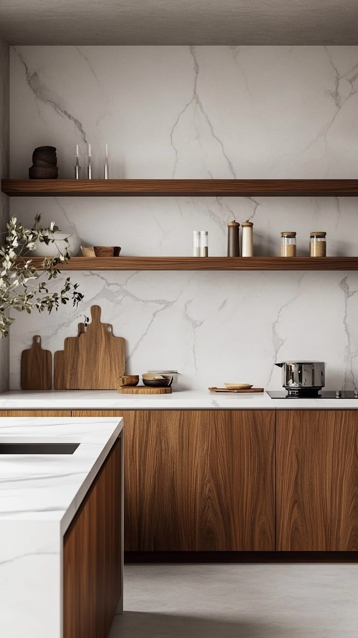 Phong cách hiện đại tối giản vẫn là xu hướng chủ đạo. Những mẫu tủ bếp sử dụng gam màu trung tính như trắng, xám, be kết hợp với kệ gỗ tự nhiên mang lại cảm giác nhẹ nhàng, tinh tế. Kệ trang trí thường được bố trí xen kẽ giữa các tủ trên để tạo điểm nhấn.