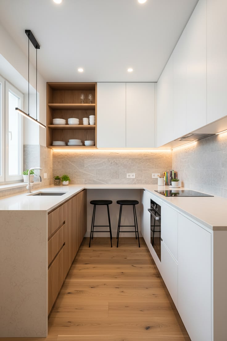 Tủ bếp chữ U thường được áp dụng cho những căn hộ có diện tích lớn hơn, mang lại không gian lưu trữ tối đa và phân chia khu vực nấu nướng rõ ràng.