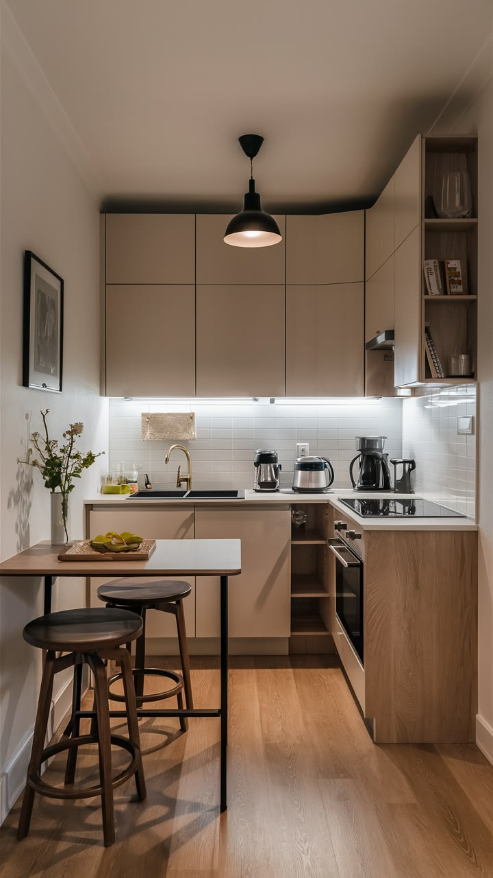Các thiết kế tích hợp như tủ bếp kết hợp bàn ăn, quầy bar mini hoặc đảo bếp nhỏ cũng giúp tăng tính tiện nghi mà không chiếm quá nhiều diện tích. Việc bố trí ánh sáng hợp lý, kết hợp đèn LED dưới tủ cũng góp phần tạo cảm giác hiện đại và ấm cúng cho căn bếp.