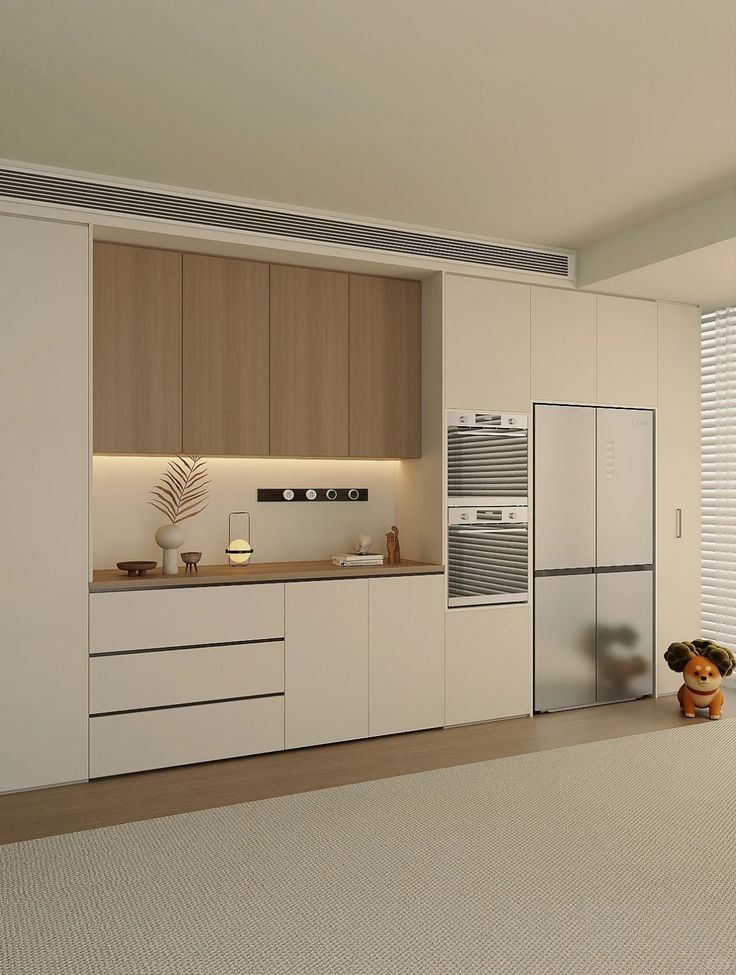 Các gam màu trung tính như trắng, xám, be và vân gỗ tự nhiên vẫn giữ vị trí chủ đạo, tuy nhiên được phối hợp tinh tế hơn để tạo điểm nhấn nhẹ nhàng nhưng không đơn điệu. Ngoài ra, xu hướng sử dụng bề mặt nhám mờ (matte) thay cho bề mặt bóng gương cũng được ưa chuộng nhằm hạn chế bám vân tay và tăng tính sang trọng.