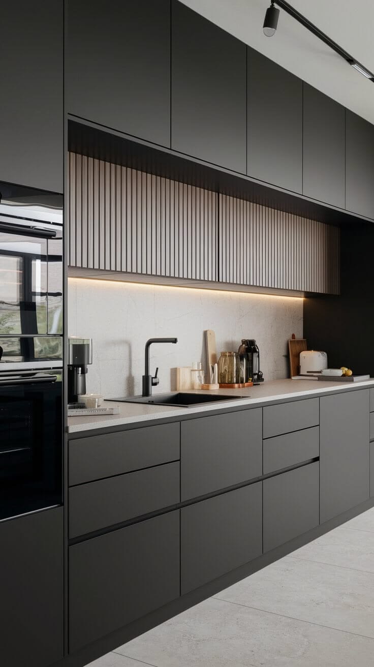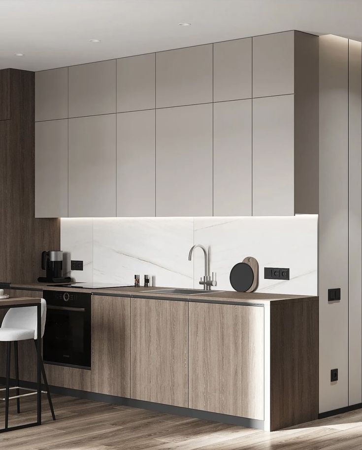 Ngoài ra, tùy theo diện tích và mặt bằng thực tế, tủ bếp hiện đại có thể được thiết kế theo nhiều kiểu như chữ I, chữ L, chữ U hoặc kết hợp đảo bếp. Với không gian nhỏ, tủ bếp chữ I hoặc chữ L là lựa chọn tối ưu giúp tiết kiệm diện tích nhưng vẫn đảm bảo đầy đủ công năng. Trong khi đó, những không gian rộng hơn có thể áp dụng tủ bếp chữ U hoặc tích hợp đảo bếp để tăng thêm khu vực sử dụng và tạo điểm nhấn thẩm mỹ.