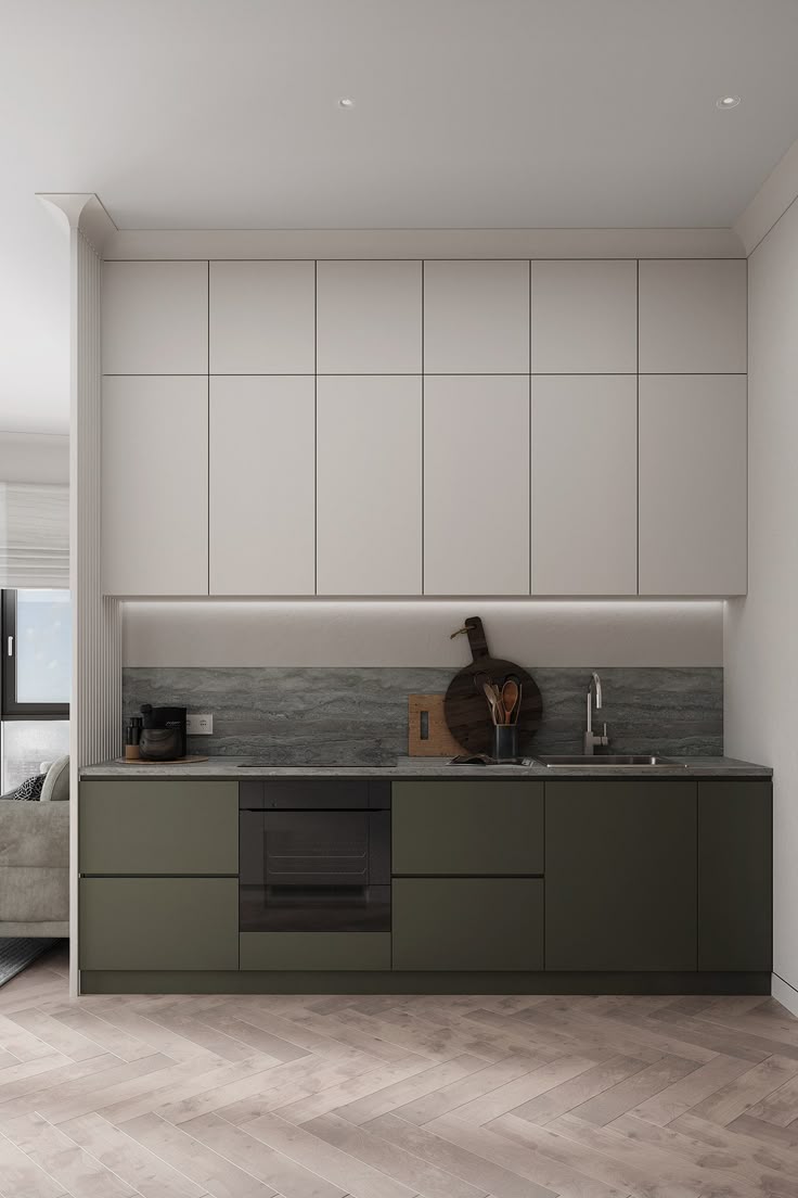 Tủ bếp chữ L lại phù hợp với không gian trung bình, tận dụng tốt các góc tường để mở rộng khu vực lưu trữ và thao tác. Thiết kế này vẫn giữ được tinh thần tối giản nhưng mang lại sự tiện lợi cao hơn khi sử dụng.