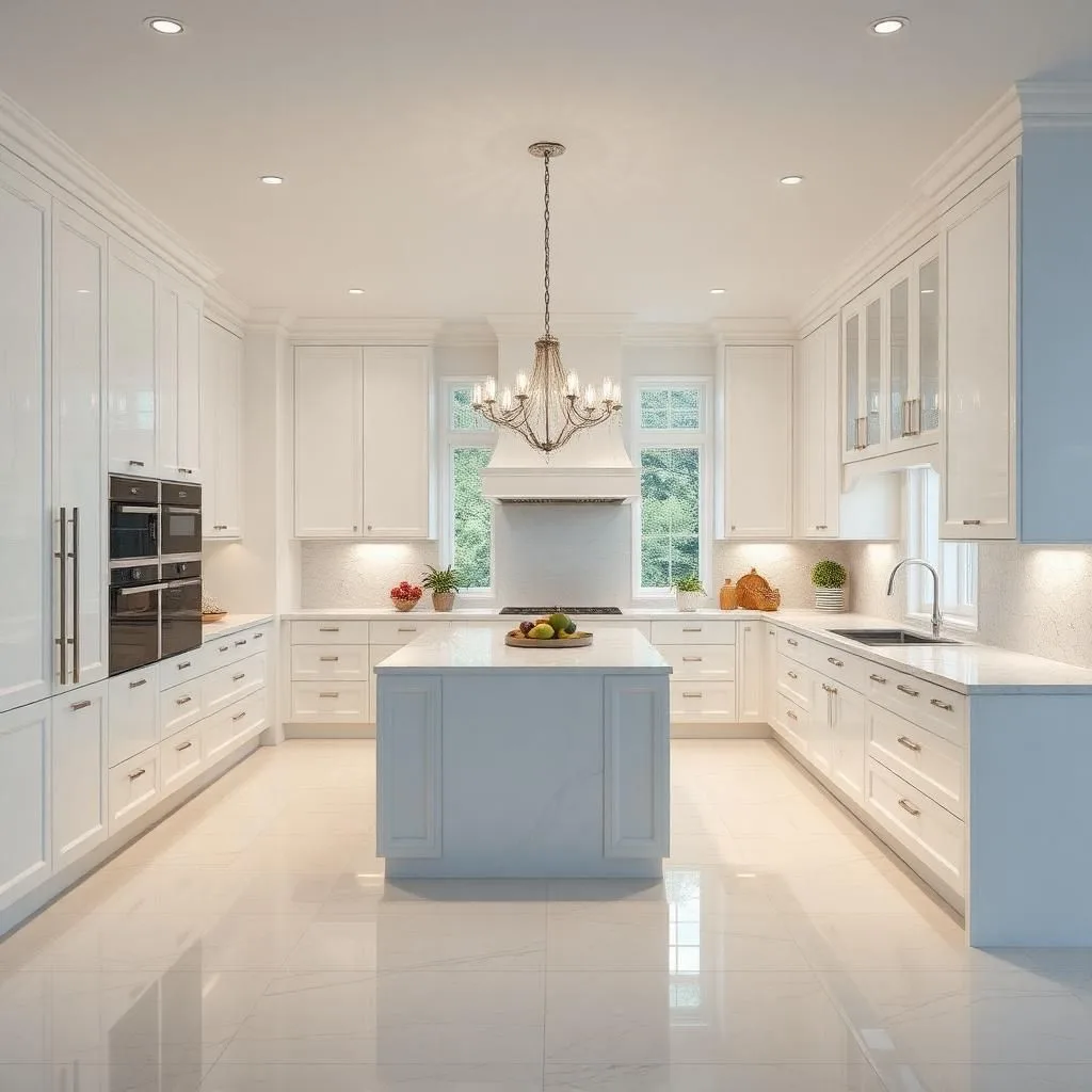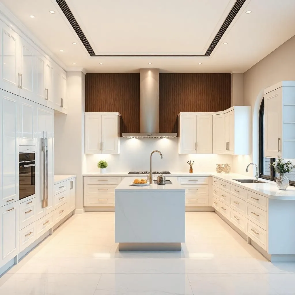 Thường thiết kế chữ U, có đảo, phong cách Luxury, tân cổ điển.
